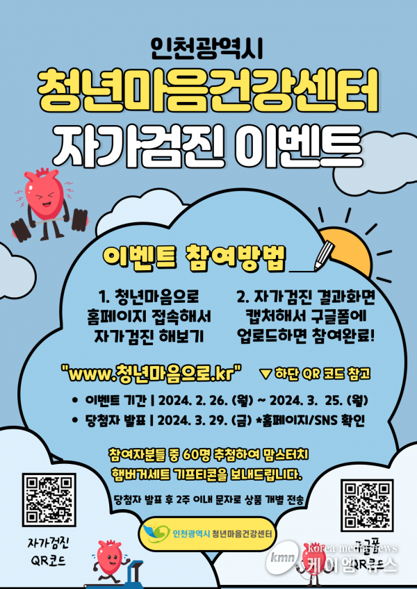 인천광역시는 오는 3월 25일까지 인천시 청년마음건강센터 홈페이지에서 자가검진 이벤트를 실시한다고 밝혔다.