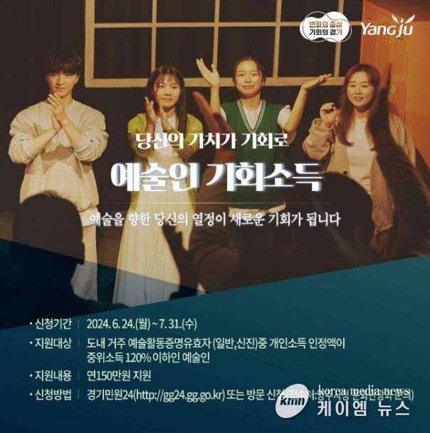 (케이엠뉴스) 양주시는 오는 24일부터 7월 31일까지 ‘경기도 예술인 기회소득’ 사업의 신청을 받는다고 밝혔다.