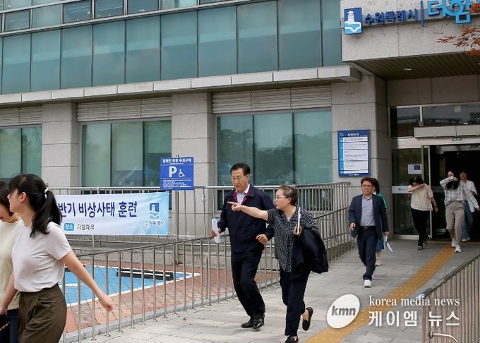 (케이엠뉴스) 26일 오후 수원특례시 권선구 더함파크 청사에서 열린 ‘24년도 수원도시공사 복합재난 훈련’에서 지진 발생으로 인한 건물 화재 및 대피 훈련을 진행했다.