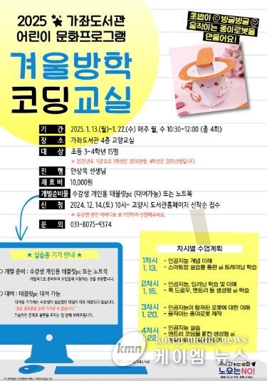 (케이엠뉴스) 고양특례시 가좌도서관은 오는 1월 13일 부터 1월 22일까지 총 4회에 걸쳐 매주 월요일과 수요일에 어린이 코딩 프로그램 ‘2025 겨울방학 코딩교실’을 운영한다고 밝혔다.