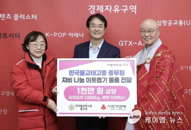 (케이엠뉴스) 고양특례시는 지난 5일, 한국불교 태고종 총무원으로부터 고양시 취약계층을 위한 김치 10Kg 100박스, 라면100박스, 고무장갑 500세트를 전달받았다고 밝혔다.