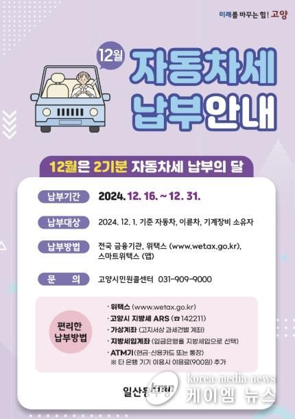 (케이엠뉴스) 고양특례시 일산동구는 2024년 제2기 정기분 자동차세 68,867건, 약 116억 원을 부과하고, 13일 고지서를 발송했다고 밝혔다.
