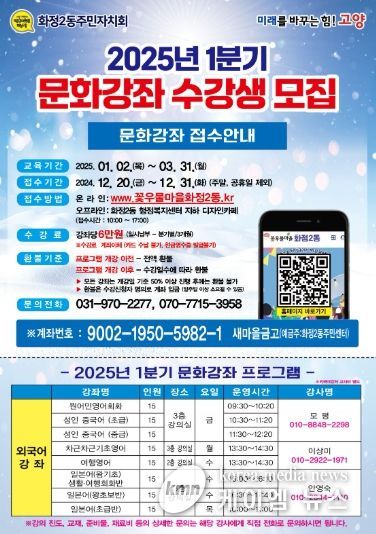(케이엠뉴스) 고양특례시 덕양구 화정2동 주민자치회가 12월 20일부터 31일까지 2025년 1분기(1월~3월) 문화강좌 프로그램 수강 신청을 받고, 내년 1월 2일부터 프로그램 운영을 시작한다.