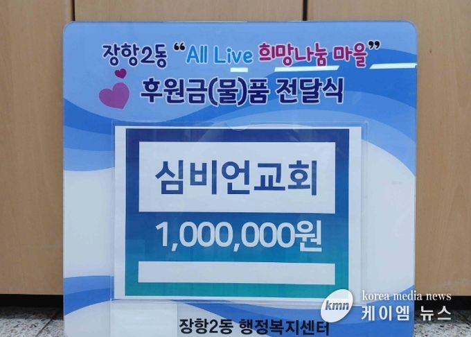 이날 심비언교회 변기영 목사와 관계자가 장항2동 행정복지센터를 직접 찾아와 100만 원의 성금을 전달하며 지역사회 내 도움이 필요한 가구에 나눠 주길 바란다고 전했다.