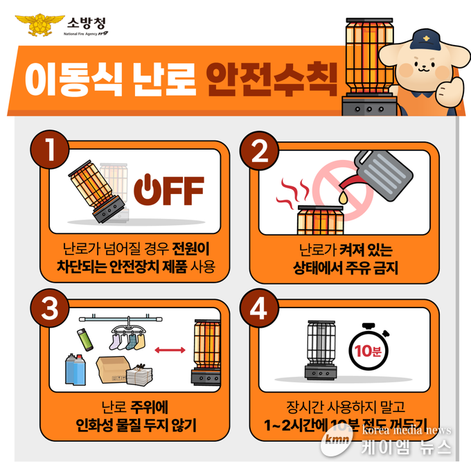 화재 예방을 위해서는 이동식 난로 등 임시 난방기기 사용을 자제하고, 고정식 난방시설 점검과 피난로 주변 적치물 제거 등 기본 안전수칙을 철저히 준수해야 한다.