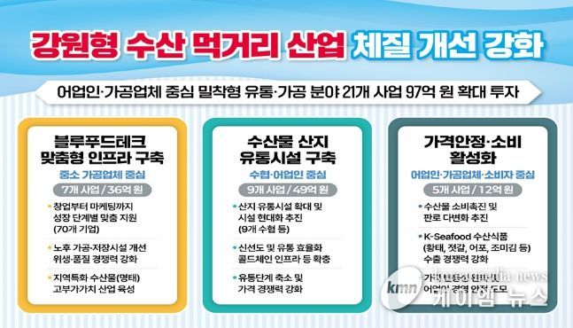 (케이엠뉴스) 강원특별자치도는 수산 먹거리 산업을 단순 생산 중심 구조에서 벗어나 가공·유통·소비로 이어지는 블루푸드테크(Blue Food-Technology) 산업화와 연계해 총 21개 사업, 97억 원 규모의 종합 지원책을 본격 추진한다.