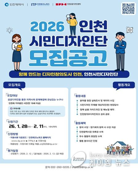 (케이엠뉴스) 인천광역시는 1월 28일부터 2월 11일까지 시민 중심의 공공디자인 혁신을 이끌 ‘인천시민디자인단’을 모집한다고 밝혔다.