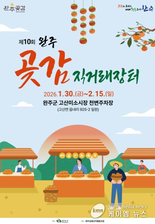 (케이엠뉴스) 완주군이 설 명절을 앞두고 오는 30일부터 2월 15일까지 고산면 고산미소시장 천변주차장에서 제10회 완주곶감 직거래장터를 개최·운영한다.