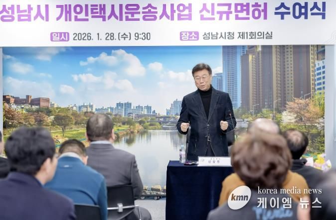 (케이엠뉴스) 성남시는 28일 오전 9시30분 시청 제1회의실에서 개인택시운송사업 신규 면허 수여식을 열고, 장기 무사고 운전 경력을 보유한 운수종사자 10명에게 개인택시 면허증을 수여했다. 이는 2010년 이후 근 16년 만에 이뤄진 성남시 개인택시 신규면허 발급이다.