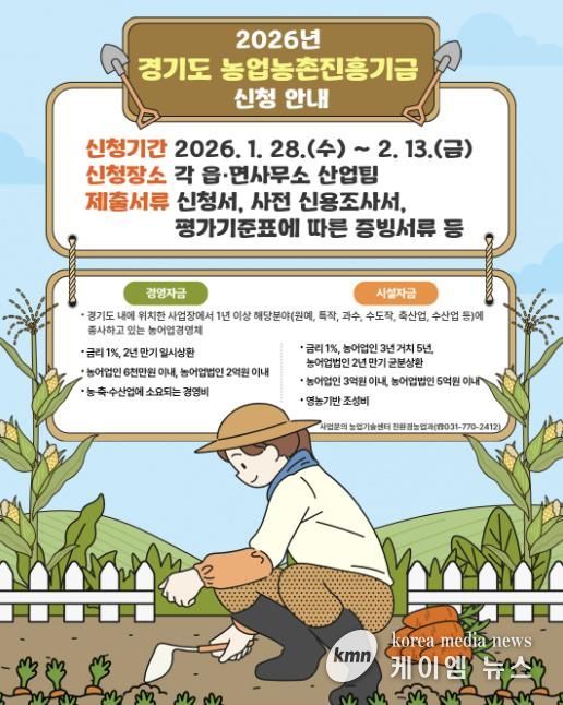 (케이엠뉴스) 양평군은 농어업인의 소득 향상과 삶의 질 개선, 경영 안정을 도모하고 농업 경쟁력을 강화하기 위해 2026년 경기도 농업농촌진흥기금 ‘경영 및 시설자금 지원’ 대상자를 모집한다고 밝혔다.