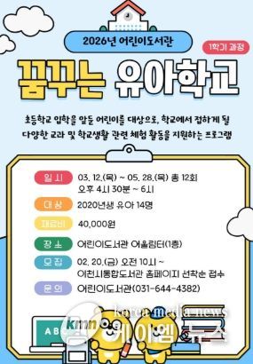 (케이엠뉴스) 이천시 어린이도서관은 초등학교 입학을 앞둔 2020년생 유아를 대상으로 독서·체험 프로그램인 ‘2026년 꿈꾸는 유아학교’를 운영한다.