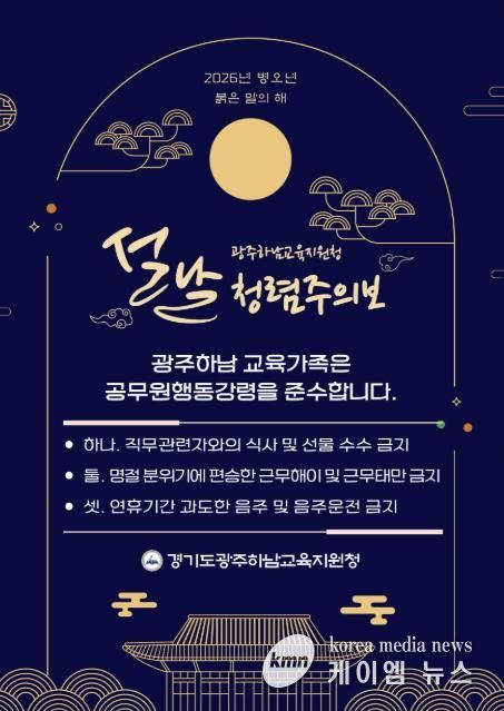 (케이엠뉴스) 경기도광주하남교육지원청은 2월 9일, 2026년 병오년 설명절을 맞아 관내 교직원들이 청렴한 마음가짐으로 새해를 시작할 수 있도록‘교육장 청렴서한문’과‘청렴주의보’를 각급 학교에 전달했다.