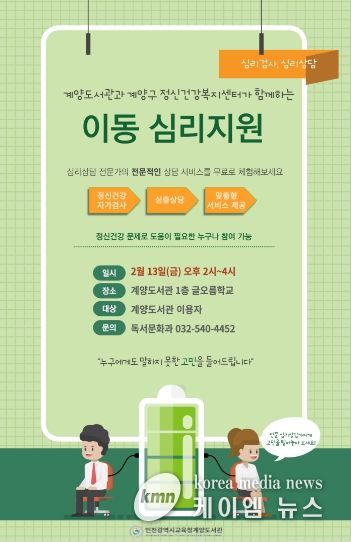 (케이엠뉴스) 인천광역시교육청계양도서관은 지역 주민의 마음건강 증진을 위하여 계양구 정신건강복지센터와 연계해 ‘이동 심리지원’사업을 운영한다.