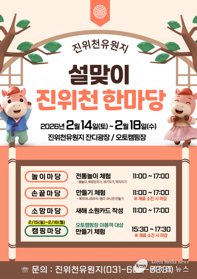 평택도시공사(사장 한병수)는 설 연휴를 맞아 2월 14일(토)부터 18일(수)까지 진위천유원지에서 “설맞이 진위천 한마당”을 운영한다고 밝혔다.