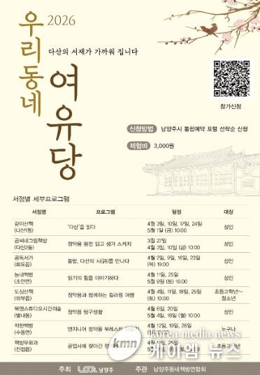 (케이엠뉴스) 남양주시는 오는 27일부터 시민이 생활과 밀접한 동네 책방에서 다산 정약용을 접할 수 있도록 ‘우리동네 여유당’ 프로그램을 운영한다고 10일 밝혔다.