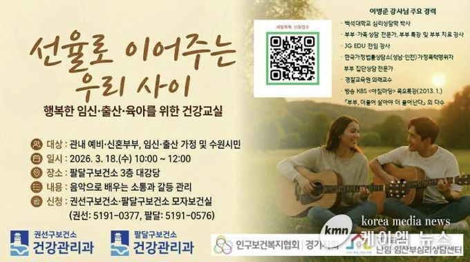 (케이엠뉴스) 수원시보건소(권선·팔달)가 3월 18일 오전 10시 팔달구보건소 대강당에서 행복한 임신·출산·육아를 위한 건강교실 ‘선율로 이어주는 우리 사이’를 개최한다. 수원시 예비·신혼부부와 임신·출산 가정, 수원시민 누구나 참여할 수 있다.