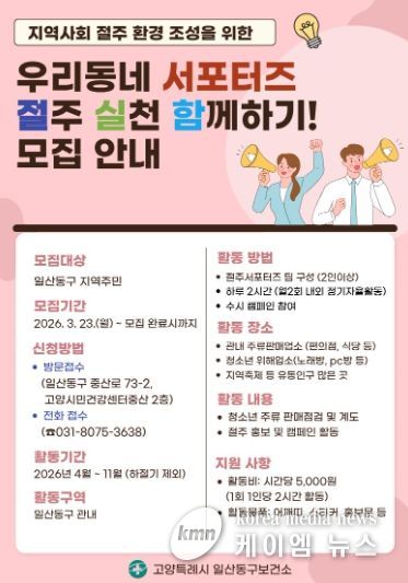 (케이엠뉴스) 고양특례시 일산동구보건소는 건전한 음주문화 확산과 절주 실천 분위기 조성을 위한 ‘우리동네 서포터즈’의 참가자를 오는 3월 23일부터 모집한다.