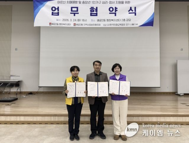 (케이엠뉴스) 시흥시 배곧2동 행정복지센터는 지난 3월 24일 행정복지센터 2층 강당에서 배곧2동 지역사회보장협의체, (사)한국치매교육협회 경기 시흥지부와 ‘어르신 치매예방 및 중장년 1인 가구 정서 지원을 위한 업무협약’을 체결했다.