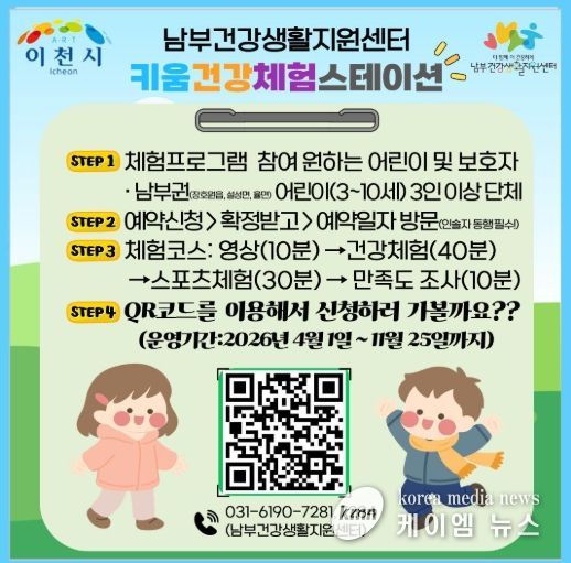 (케이엠뉴스) 이천시 남부건강생활지원센터는 어린이의 올바른 생활 습관 형성을 위해 체험형 프로그램인 ‘남부 키움건강체험스테이션’을 오는 4월부터 운영한다고 밝혔다.