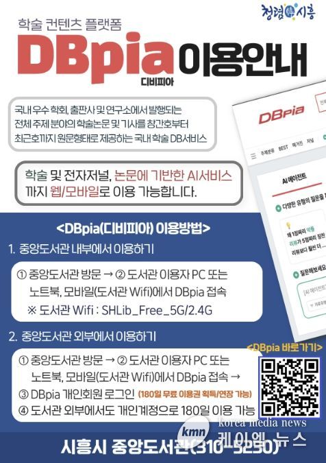 (케이엠뉴스) 시흥시중앙도서관은 시민들의 연구·학습 활동을 적극 지원하고 지식정보 접근성을 높이기 위해 국내 대표 학술 콘텐츠 플랫폼인 ‘디비피아(DBpia)’ 이용 서비스를 지난 3월 27일부터 시작했다.