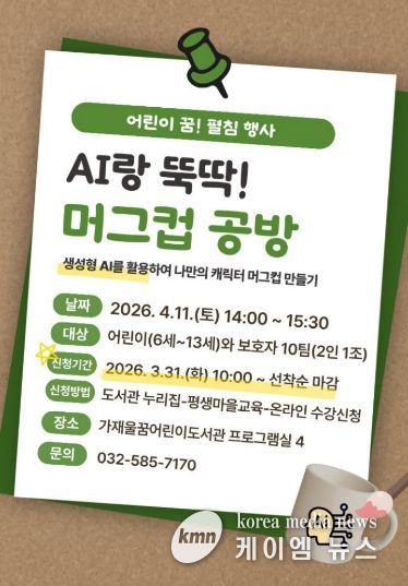 (케이엠뉴스) 인천광역시교육청서구도서관은 오는 4월, 어린이를 동반한 가족이 참여하는 생성형 AI를 활용한 특별 프로그램 ‘AI랑 뚝딱! 머그컵 공방’을 운영한다.
