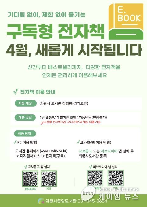 (케이엠뉴스) 의왕시가 4월부터 시민의 정보 접근성을 높이고 디지털 독서문화 확산을 위해 ‘구독형 전자책 서비스’와 ‘온라인 학술 데이터베이스(DBpia) 서비스’를 도입한다.
