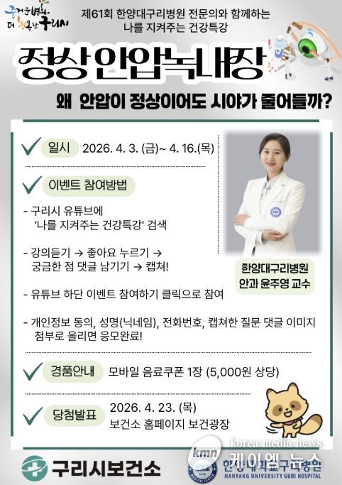 시민들은 4월 3일부터 16일까지 구리비전 채널을 통해 강의를 시청한 후 궁금한 사항을 댓글로 남기면, 우수질문 3건을 선정해 한양대구리병원 안과 윤주영 교수가 직접 답변할 예정이다. 또한 참여자 중 17명을 무작위로 선정해 총 20명에게 모바일 쿠폰을 증정한다.