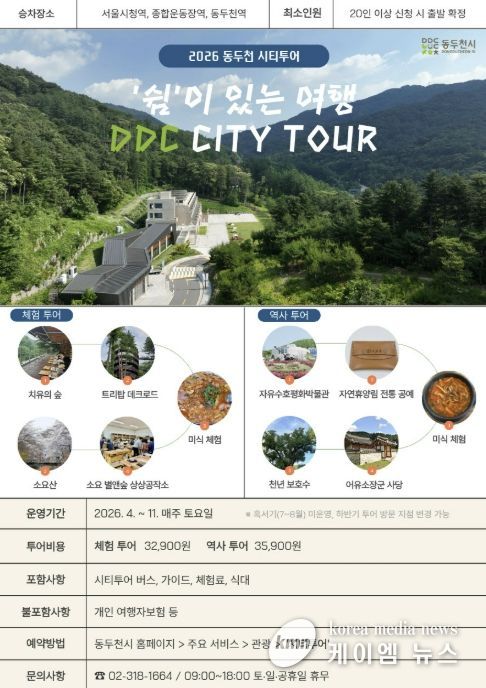 (케이엠뉴스) 동두천시는 벚꽃 명소와 자연 힐링, 공예 체험을 함께 즐길 수 있는 ‘2026 동두천 시티투어(DDC City tour)’를 오는 4월부터 혹서기를 제외하고 매주 토요일 운영한다고 밝혔다.