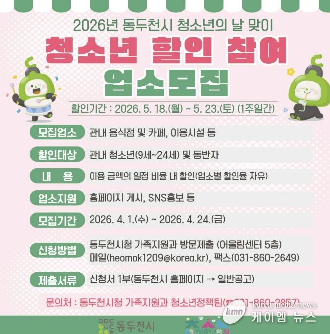 (케이엠뉴스) 동두천시는 오는 5월 청소년의 날을 맞이하여 청소년 복지를 증진하고 지역경제를 활성화하기 위해 오는 5월 18일부터 5월 23일까지 6일간 ‘청소년 할인 주간’을 운영한다.