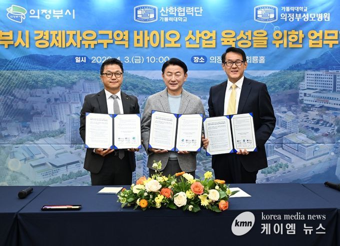 (케이엠뉴스) 의정부시는 4월 3일 시청 회룡홀에서 가톨릭대학교 의정부성모병원, 가톨릭대학교 산학협력단과 함께 ‘의정부시 경제자유구역 바이오 산업 육성을 위한 업무협약’을 체결했다.