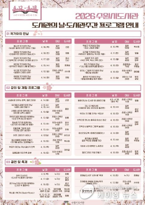 ‘아트 인사이드(창룡·광교홍재도서관, 4월 9~17일)’, ‘사계-봄 축제(호매실도서관, 4월 18일)’ 등 6개의 공연·축제가 열린다. ‘이진아 작가와의 만남(호매실도서관, 4월 15일)’, ‘예소연 작가와의 만남(선경도서관, 4월 16일)’ 등 12개의 저자 초청 강연도 열린다.