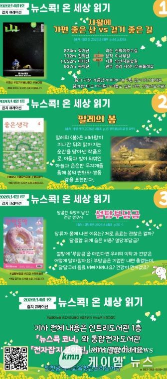 (케이엠뉴스) 인천광역시교육청신트리도서관은 시민에게 다양한 읽을거리를 제공하고 연속간행물 이용을 활성화하기 위해, 잡지 큐레이션 서비스 ‘뉴스콕! 온 세상 읽기’를 운영한다고 6일 밝혔다.