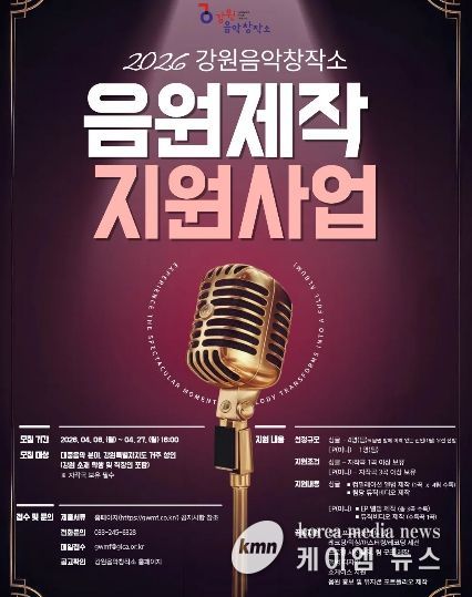 (케이엠뉴스) 강원음악창작소가 오는 27일까지 도내 역량 있는 뮤지션을 발굴하기 위해 ‘2026년 음원제작 지원사업’의 참여자를 모집한다.