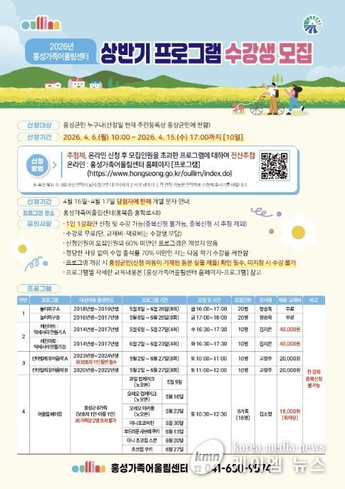 모집 기간은 2026년 4월 6일 10시부터 4월 15일 17시까지로, 접수 방법은 홍성가족어울림센터 홈페이지에서 온라인 접수로만 가능하다.