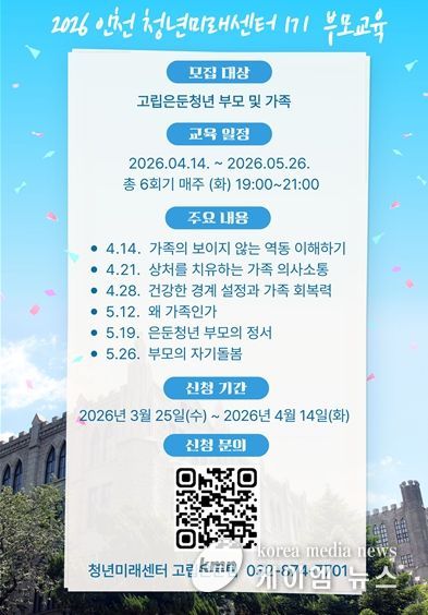 강의는 ‘우리 가족의 보이지 않는 역동 이해하기’ ‘상처를 치유하는 가족 의사소통’ ‘건강한 경계 설정과 가족 회복력’ ‘왜 가족인가’ ‘은둔청년 부모의 정서’ ‘부모의 자기돌봄’ 등을 주제로 한다.