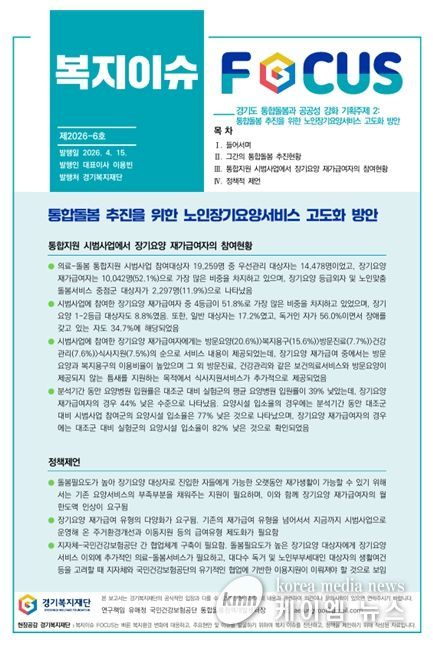 (케이엠뉴스) 경기복지재단(대표이사 이용빈)은 통합돌봄 정착을 위한 노인장기요양서비스 고도화 방안을 주제로 '복지이슈포커스 제6호' 보고서를 발간했다.