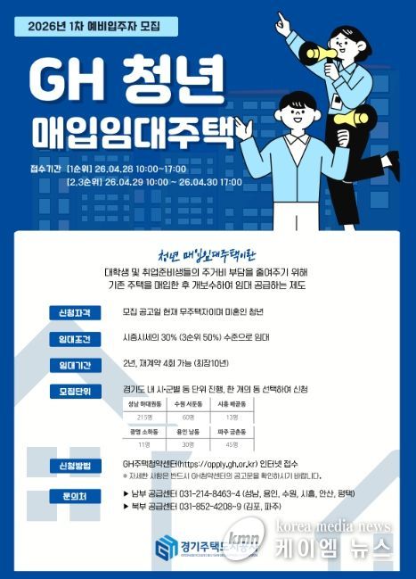 (케이엠뉴스) 경기주택도시공사(GH)가 청년층 주거 부담을 덜고 안정적인 생활 기반을 마련할 수 있도록 청년 및 자립준비 청년을 위한 매입임대주택 예비입주자 396명을 모집한다고 27일 밝혔다.