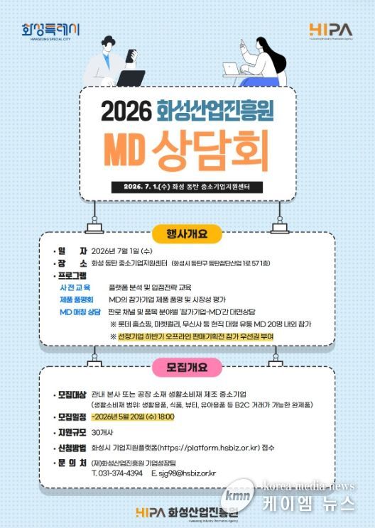 (케이엠뉴스) 화성산업진흥원(원장 전병선)은 화성시 생활소비재 기업의 대형 유통망 진입과 신규 판매채널 확보를 지원하기 위해 ‘2026년 화성산업진흥원 MD 상담회’를 개최하고, 오는 5월 20일까지 참여기업을 모집한다.
