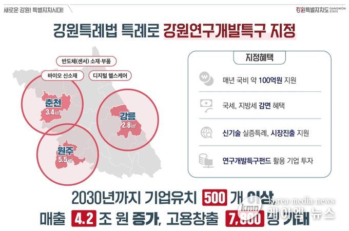김진태 강원특별자치도지사는 “엄격한 요건으로 시도조차 못했던 불가능이 강원특별법 특례를 통해 가능하게 됐다”며, “춘천, 원주, 강릉을 중심으로 도 전역에서 미래산업이 크게 성장할 것으로 기대된다”고 밝혔다.