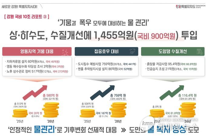 (케이엠뉴스) 강원특별자치도는 내년도에 1,455억 원을 투입하여 가뭄 및 집중호우 등 물로 인한 기후변화와 자연재해로부터 안전한 강원자치도를 만들어 나갈 계획을 밝혔다.
