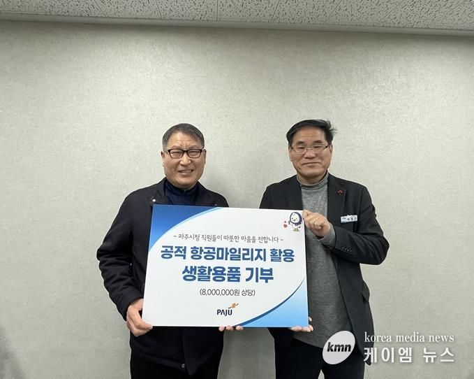 (케이엠뉴스) 파주시는 지난 24일 '2025년 공적 항공 이용 실적 점수(마일리지) 기부물품 전달식’을 열고, 공무 출장으로 발생한 항공 이용 실적 점수(마일리지)를 활용해 마련한 생활용품 385점(27개 품목)을 희망나눔푸드마켓에 전달했다고 밝혔다.