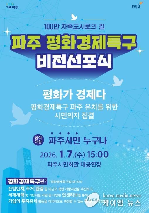 (케이엠뉴스) 파주시는 오는 1월 7일 15시, 파주시민회관 대공연장에서 ‘파주 평화경제특구 비전선포식’을 개최한다고 밝혔다.