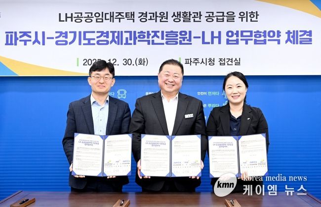 (케이엠뉴스) 파주시는 30일 경기도경제과학진흥원, 한국토지주택공사 경기북부지역본부와 경과원 파주시 이전에 따른 엘에이치(LH) 공공임대주택 생활관 지원을 위한 업무협약을 체결했다고 밝혔다.