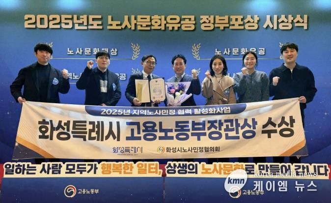 (케이엠뉴스) 화성특례시는 지난 30일 고용노동부 주관으로 열린 '2025년 노사문화유공 정부포상 시상식’에서 ‘지역노사민정 협력 유공’단체부문 고용노동부장관 표창을 수상했다고 31일 밝혔다.