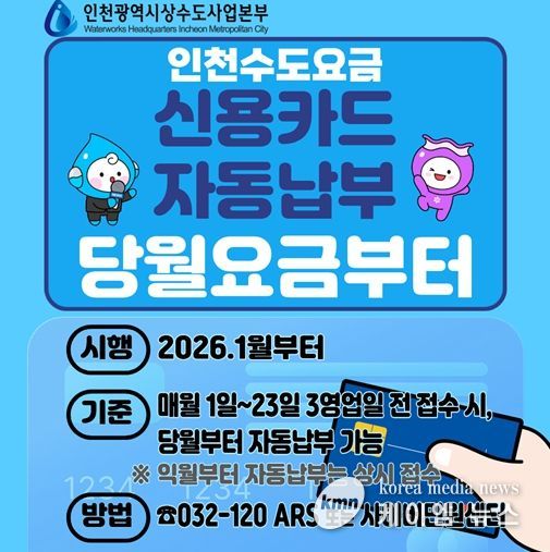 (케이엠뉴스) 인천광역시 상수도사업본부는 시민 편의 중심의 수도요금 납부 환경을 조성하기 위해, 신용카드 자동납부를 신청한 달부터 바로 적용할 수 있도록 제도를 개선해 시행했다고 1월 2일 밝혔다.