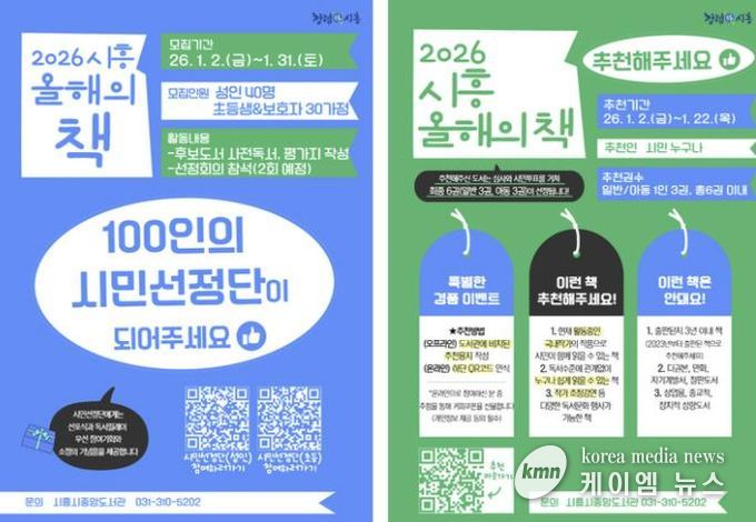 (케이엠뉴스) 시흥시가 시민 주도의 독서문화 확산을 위해 '2026 시흥 올해의 책' 사업을 본격적으로 시작한다. 시는 오는 1월 22일까지 시민이 직접 추천하는 도서를 신청받고, 올해 처음 도입하는 ‘100인의 시민선정단’을 1월 31일까지 모집한다.
