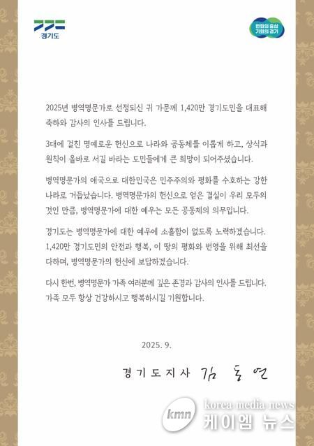 김동연 경기도지사는 서한문을 통해 “병역명문가의 애국으로 대한민국은 민주주의와 평화를 수호하는 강한 나라로 거듭났다”면서 “경기도는 병역명문가에 대한 예우에 소홀함이 없도록 노력하겠으며, 헌신에 보답하겠다”고 감사와 존경의 뜻을 표현했다.