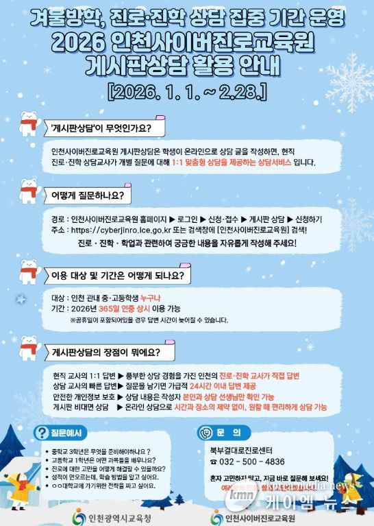 (케이엠뉴스) 인천광역시교육청은 겨울방학을 맞아 중·고등학생들이 새 학년 준비 과정에서 진로와 학업에 대한 고민을 해소할 수 있도록, 인천사이버진로교육원 ‘겨울방학 상담 집중 기간’을 1월부터 2월까지 운영한다.