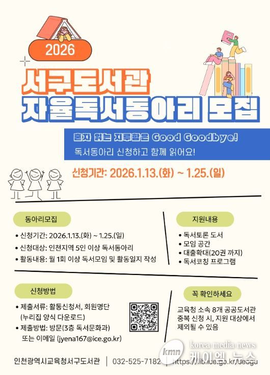 (케이엠뉴스) 인천광역시교육청서구도서관은 지역 주민들이 책으로 소통하며 함께 성장하는 즐거움을 나누는 ‘2026년 자율 독서동아리’를 13일부터 25일까지 모집한다.