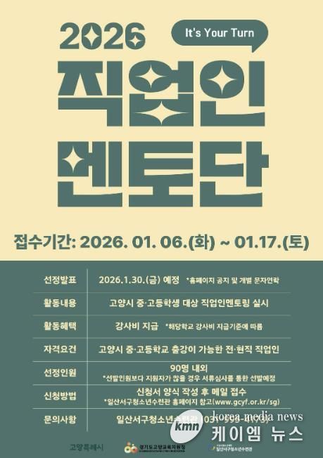 (케이엠뉴스) 고양시청소년재단 일산서구청소년수련관이 청소년들의 진로 탐색·설계를 지원하기 위한 ‘2026 직업인멘토단’을 모집한다고 밝혔다.